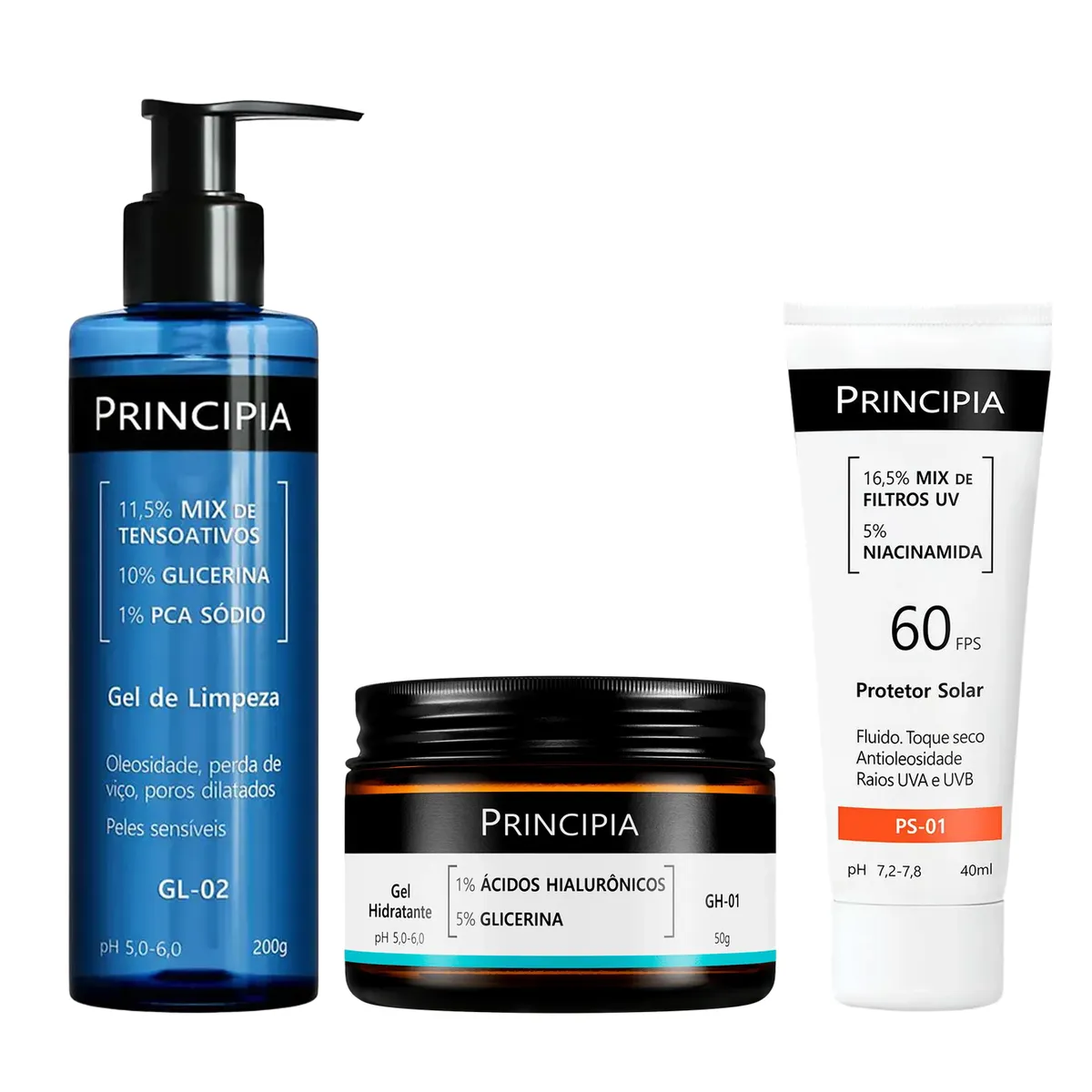 Kit Facial Principia Skincare Gel de Limpeza GL-02 200ml + Gel Hidratante GH-01 50g + Protetor Solar PS-01 FPS 60 40ml