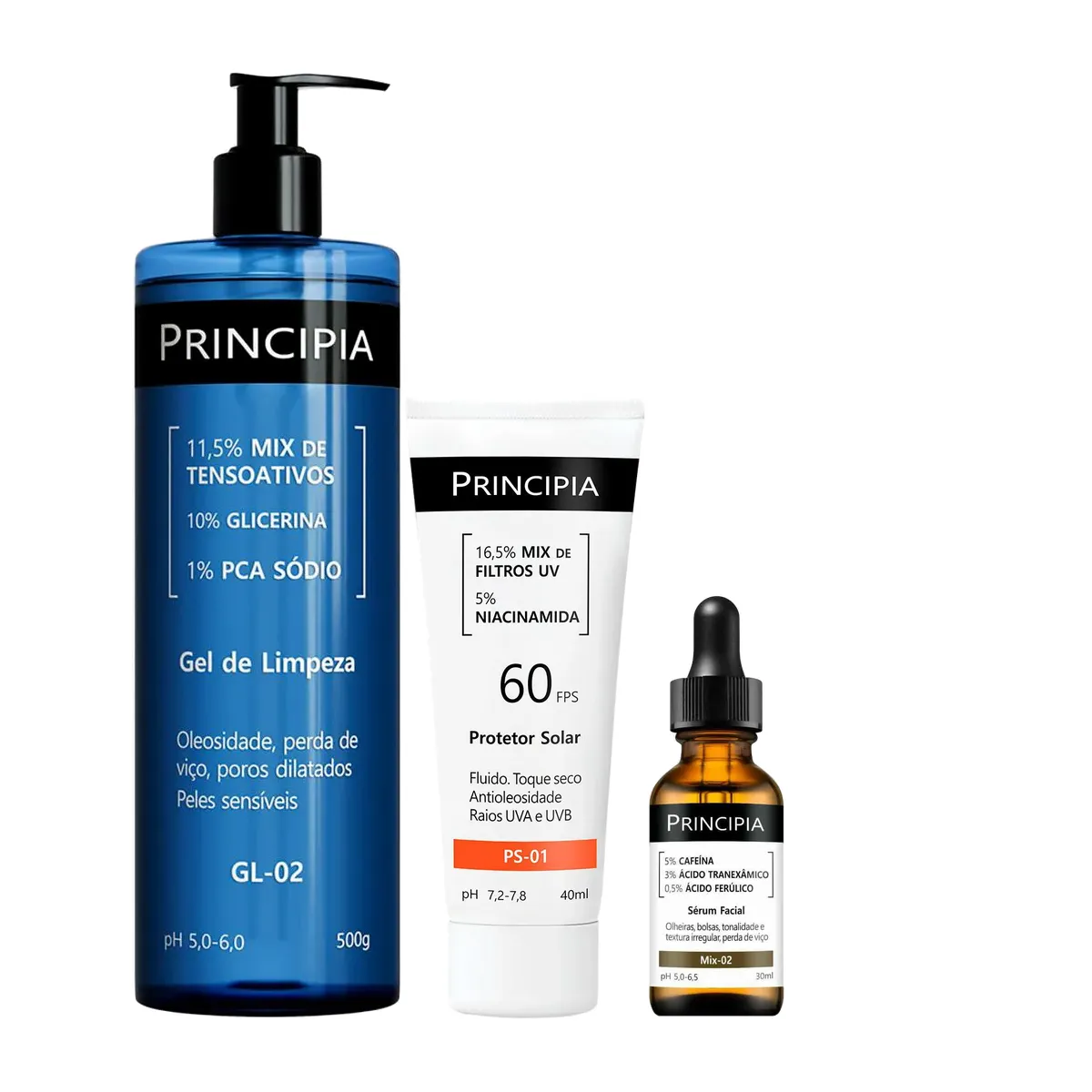 Kit Facial Principia Skincare Gel de Limpeza GL-02 500ml + Protetor Solar PS- 01 FPS 60 40ml + Sérum Anti-Idade Mix-02 30ml