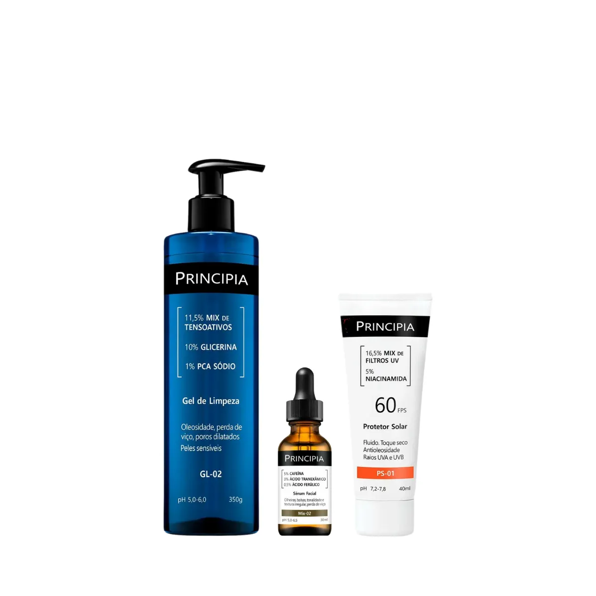 Kit Facial Principia Skincare Gel de Limpeza Suave GL-02 350ml + Protetor Solar PS-01 FPS 60 40ml + Sérum Anti-Idade Mix-02 30ml