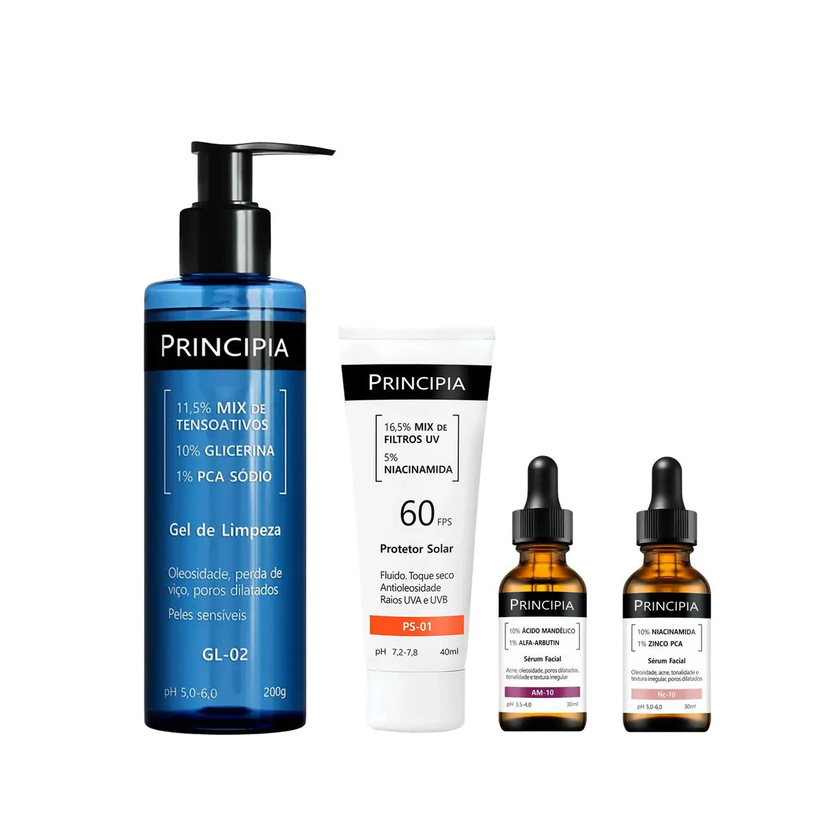 O Kit Facial Principia Skincare Protetor Solar PS- 01 FPS 60 + Gel de Limpeza GL-02 + Sérum Renovador AM-10 + Sérum Anti-Idade NC-10 é um conjunto de produtos desenvolvidos para cuidar da pele de forma completa. O gel de limpeza suave remove impurezas e promove hidratação, enquanto o protetor solar protege contra os danos causados pelos raios UV. O sérum facial renovador contém ácido mandélico e alfa-arbutin para clarear manchas e uniformizar o tom da pele, e o sérum facial anti-idade possui niacinamida e zinco PCA para combater os sinais do envelhecimento.