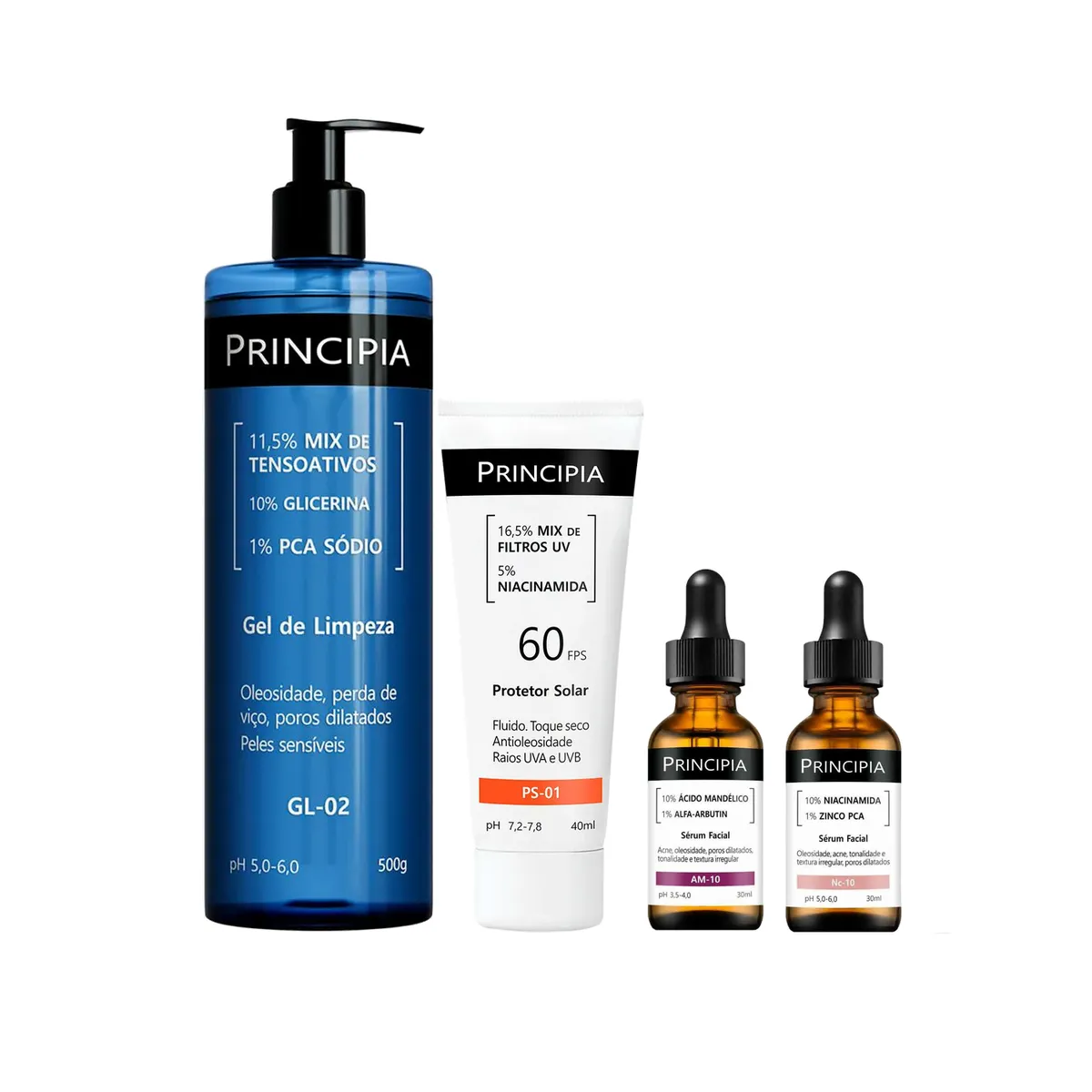 O Kit Facial Principia Skincare Protetor Solar PS- 01 FPS 60 + Gel de Limpeza GL-02 + Sérum Renovador AM-10 + Sérum Anti-Idade NC-10 é um conjunto de produtos desenvolvidos para cuidar da pele de forma completa. O gel de limpeza suave remove impurezas e promove hidratação, enquanto o protetor solar protege contra os danos causados pelos raios UV. O sérum facial renovador contém ácido mandélico e alfa-arbutin para clarear manchas e uniformizar o tom da pele, e o sérum facial anti-idade possui niacinamida e zinco PCA para combater os sinais do envelhecimento.