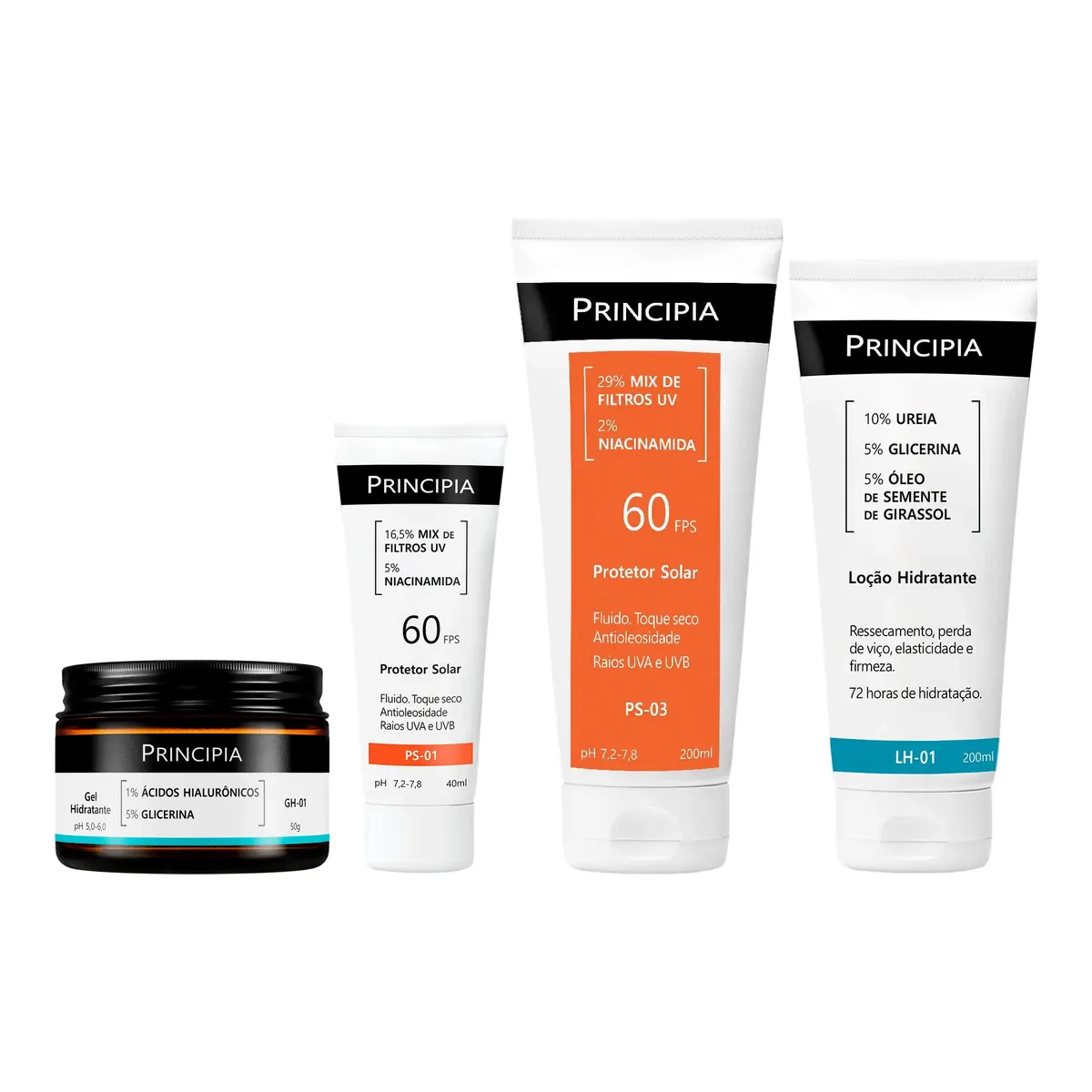 Kit Facial Principia Skincare Protetor Solar PS- 01 FPS 60 40ml + Gel Hidratante GH-01 50g + Loção Hidratante LH-01 200ml + Protetor Solar PS-03 FPS 60 200ml
